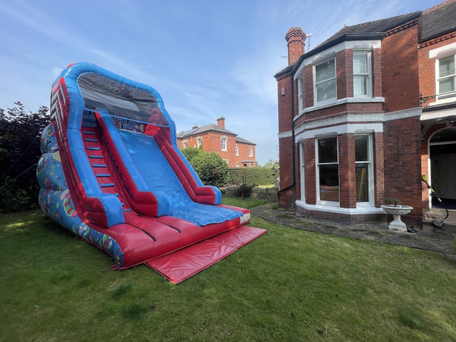 Our Platform Party Time Mega Slide is the pinnacle of party entertainment, featuring a thrilling 12ft platform that promises an exhilarating slide experience. With a floor space covering 15ft in width and 20ft in length, it offers ample room for guests to slide to their heart's content.