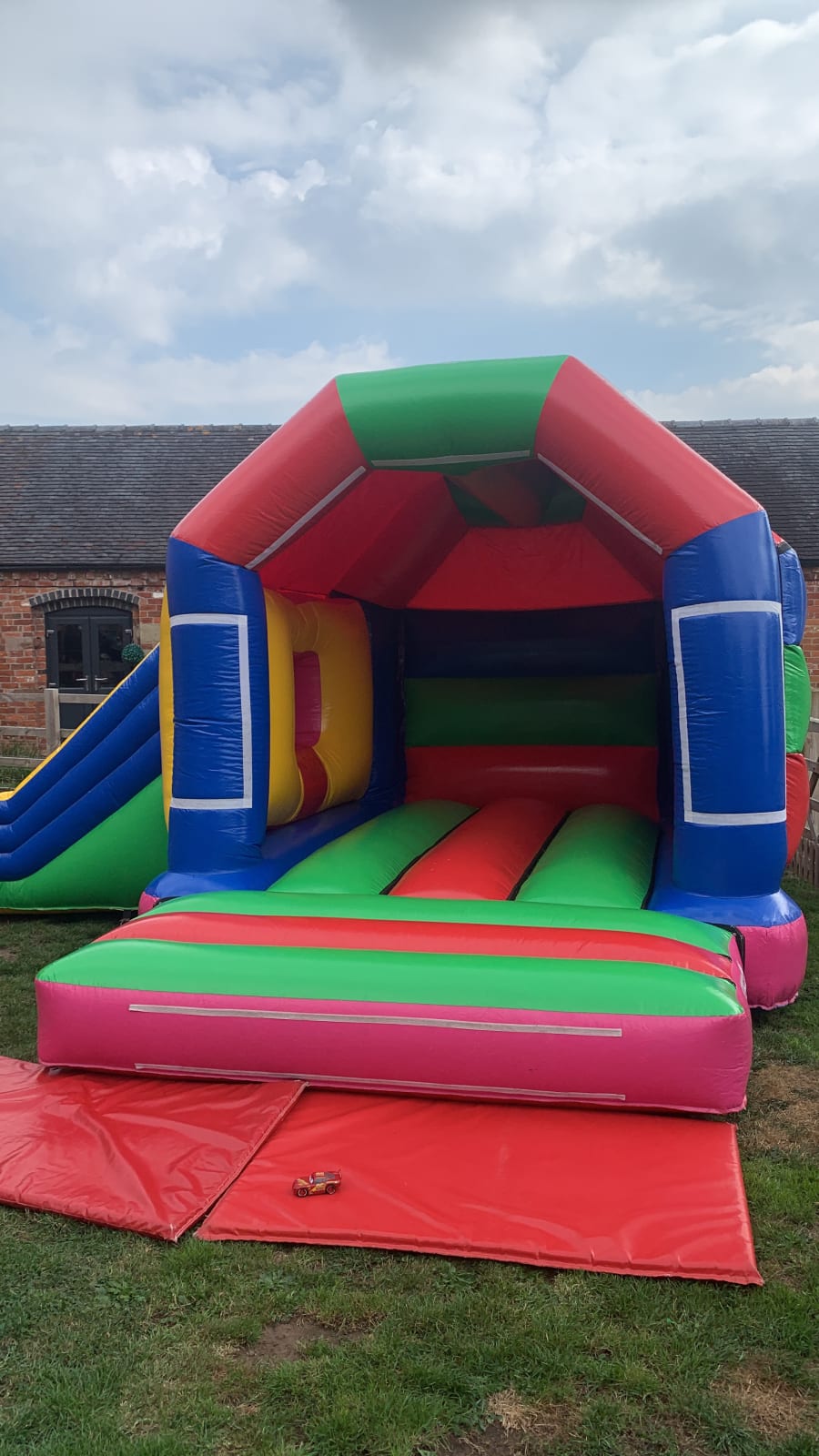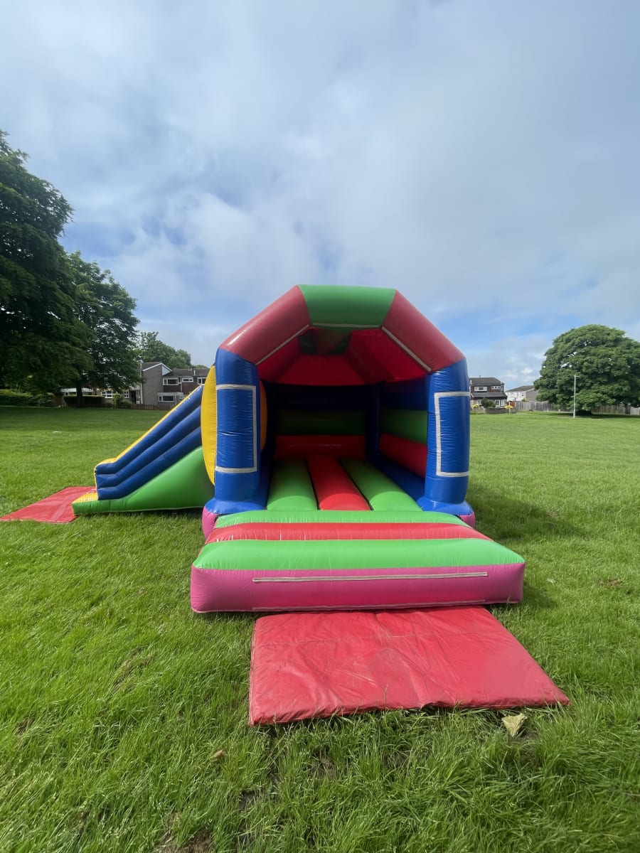 This inflatable is an alternative to any of our front slide combi's as it has a lot more bounce space. The slide part is also on the left side of the inflatable as opposed to the 17ft by 15ft Multi Coloured Side Slide Combi open roof which has a slide on the right hand side of the inflatable. this will help if your struggling to fit the bouncy castle in as you can choose the inflatable that best fits in your garden.