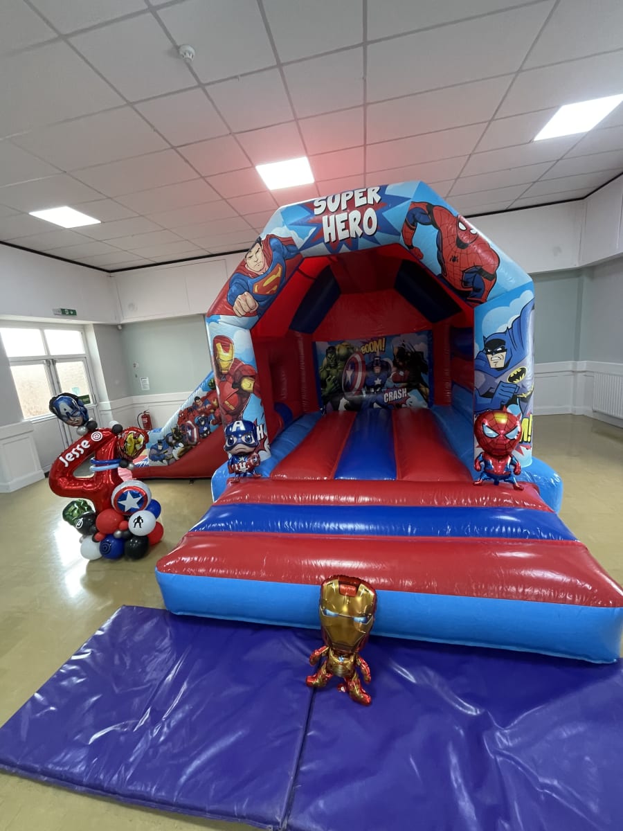 Introducing our 15ft x 17ft Super Hero Combi – the perfect addition to any celebration! This superhero-themed bouncy castle features characters from various beloved films and movies, ensuring an action-packed experience for all young heroes.