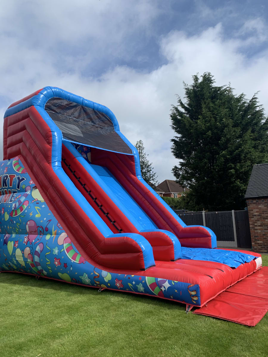 Don't miss out on turning your event into the ultimate party zone with our 12ft Platform Party Time Mega Slide! Book now and get ready for an unforgettable experience!