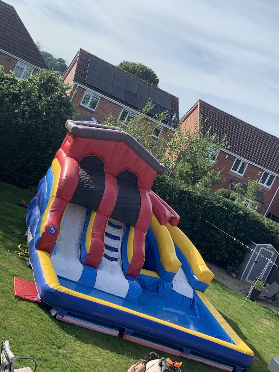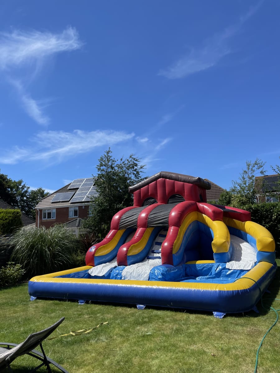 Check out our inflatable water slide, complete with two slides and a large base pool area.