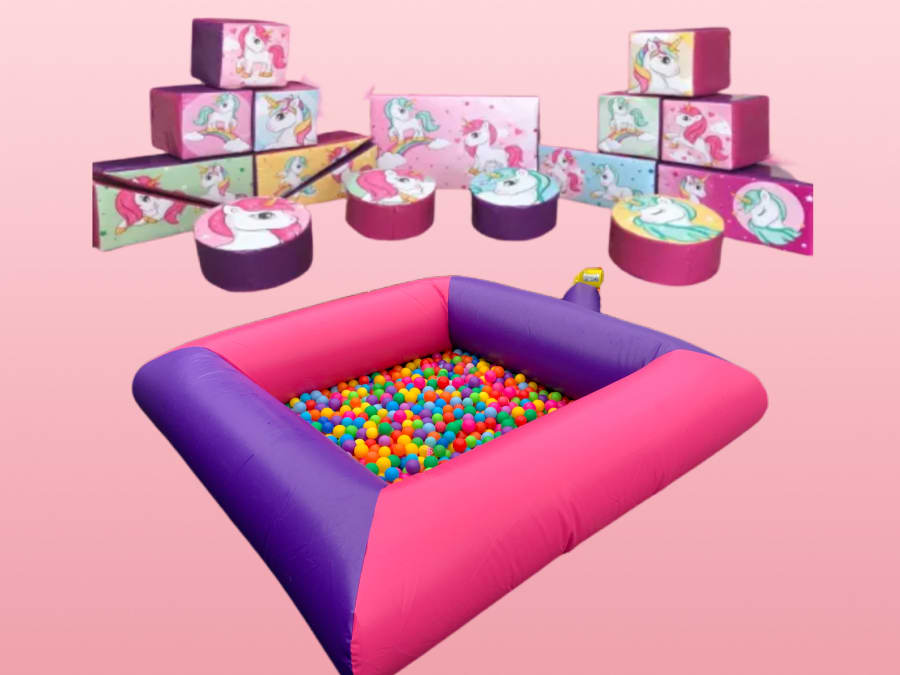 Here we have our 7ft x 7ft Pink And Purple Ball Pond and Soft play Unicorn available as a package!