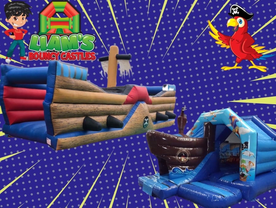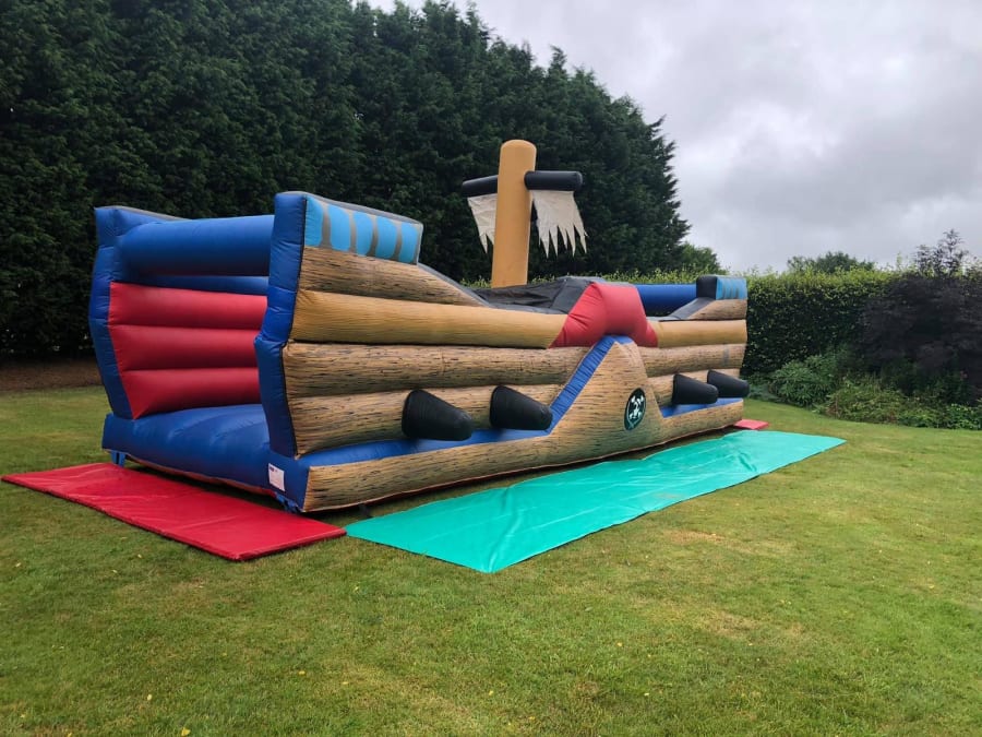 45ft of distance to cover on the 45ft Pirate Ship Obstacle Course and then lots of bounce space and a slide with the 3D Pirate Front Slide Combi