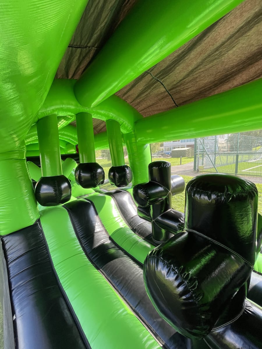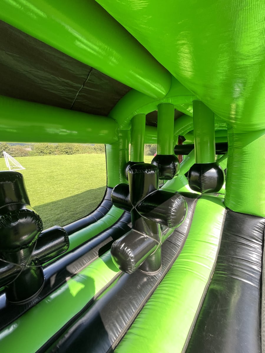 our 75ft toxic themed obstacle course is currently the biggest obstacle course you can hire in the Telford area! This huge inflatable is split into three sections, the entrance, the middle section which is filled with inflatable balls and different shaped bish bash and then the 10ft platform slide to finish!